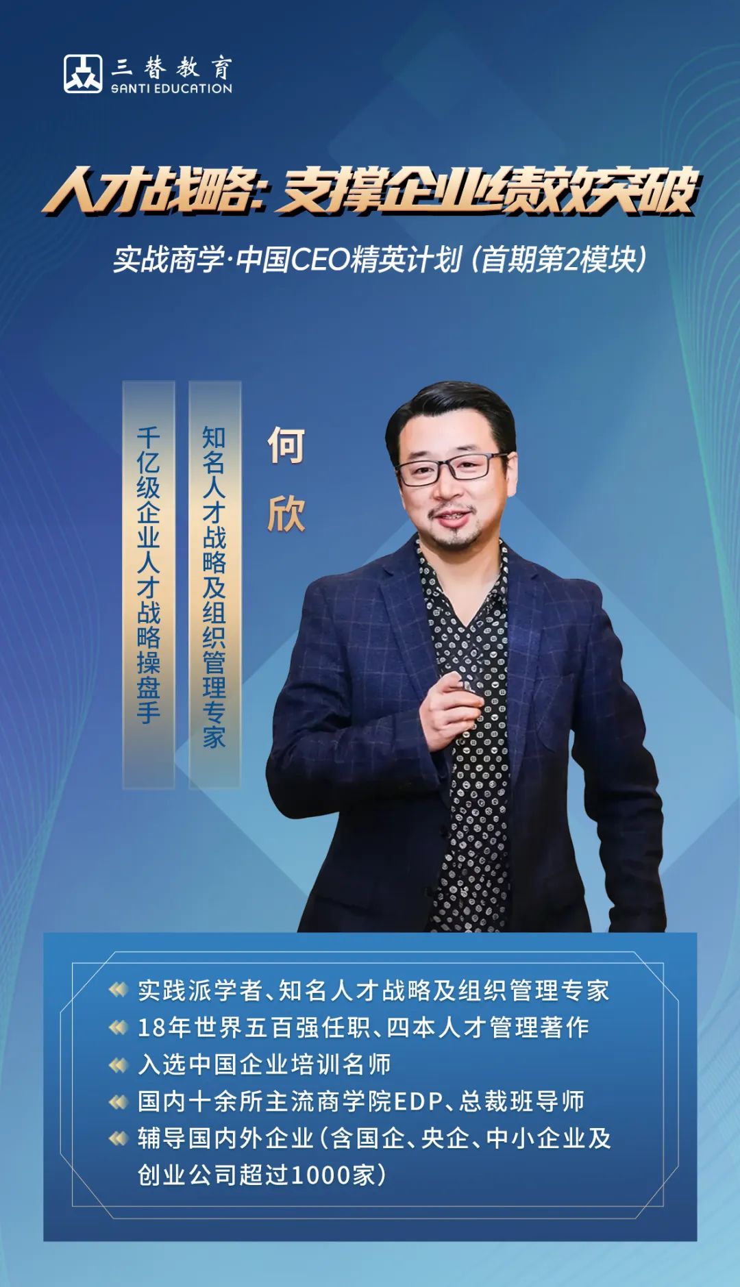 本期課程主講嘉賓何欣老師,是國內頂尖的實戰派人才戰略與組織管理專家,18年連續任職5家世界500強企業,深諳頂尖企業人才管理精髓。何老師也是千億級企業人才戰略操盤手,親自輔導超千家企業,擁有極其豐富且多元的實戰案例庫。何老師兼具業務管理者與人才管理者的雙重視角,始終堅持“一切從業務出發解決問題”的核心理念,打造“人才發展+問題解決”一體兩翼的組織運營模式。同時何欣老師是多本人才管理專著作者,理論與實戰高度融合,業界口碑卓著。