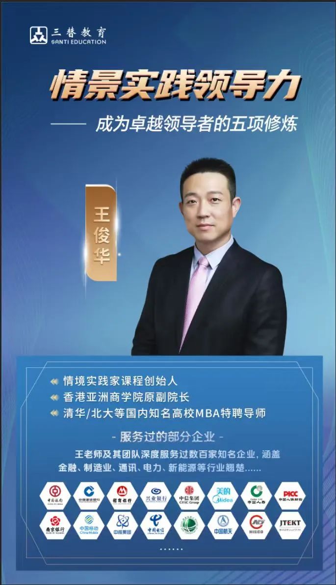 本期課程主講嘉賓王俊華老師是情境實踐家課程創始人、香港亞洲商學院原副院長,王老師擁有十五年的企業管理經驗,曾任清華、北大等國內知名高校MBA特聘講師。千場培訓、聲譽卓著,融匯理論與實務,持續為企業發展賦能助力,贏得了業界良好的口碑和贊譽。