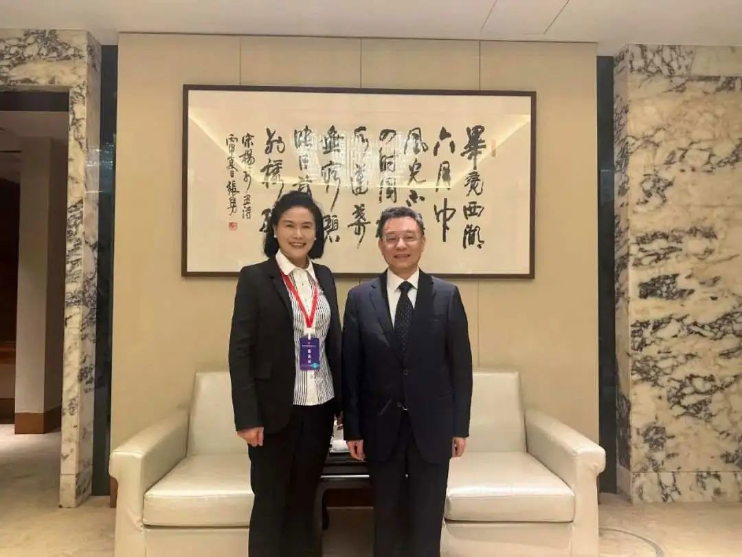 與會期間杭州市委常委、統戰部部長朱建明與三替集團董事長陶曉鶯在貴賓室親切交流