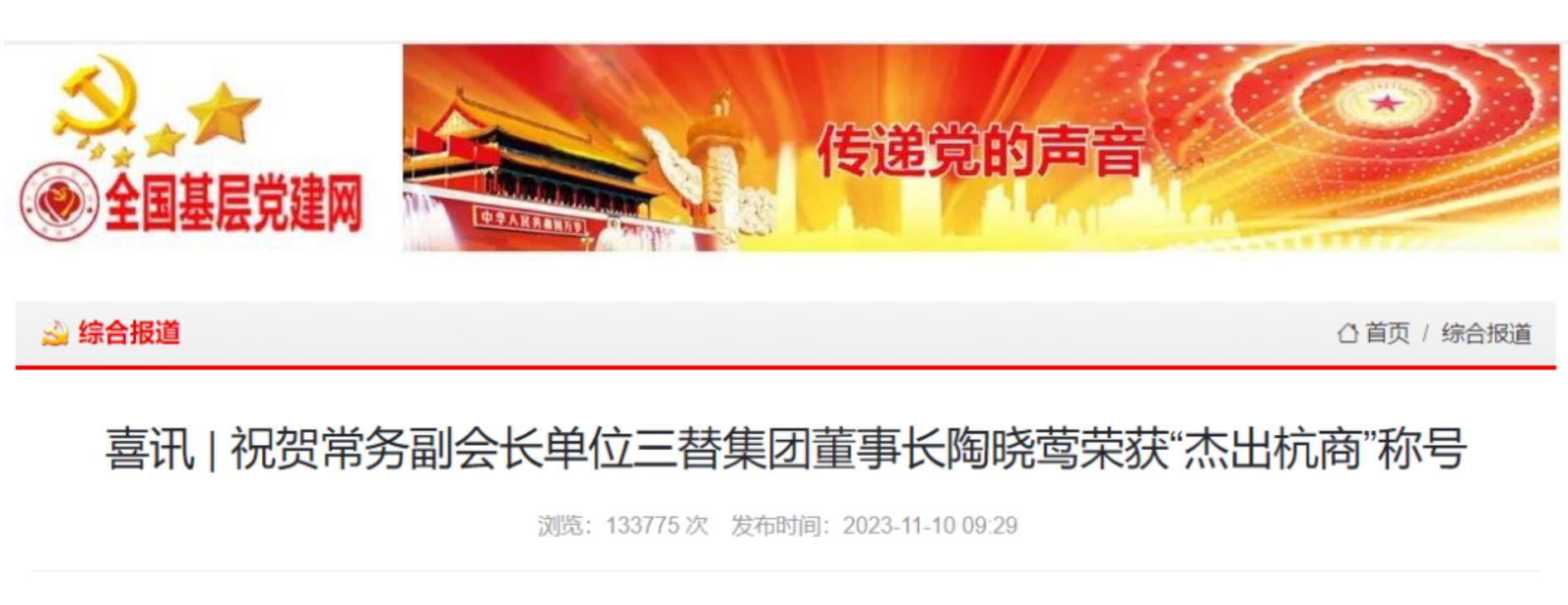 全國基層黨建網轉載刊登——三替集團董事長陶曉鶯榮獲“杰出杭商”稱號的報導